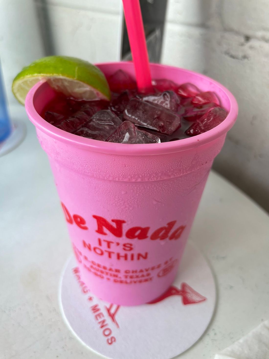 Me pregunto qué sería de este blog sin hablarte de De Nada. Hasta ahora nunca me ha fallado. Su concepto es simple y encantador: una cantina relajada, sin pretensiones, enfocada en servir comida mexicana hecha con cariño, tortillas frescas y sabores que abrazan. Todo se siente auténtico y al mismo tiempo muy “Austin”. La comida es deliciosa y fresca, con variedad de tacos y pequeños bocados para quienes comen carne y también para quienes prefieren opciones vegetarianas. Y su agua de Jamaica, siempre tan refrescante… la amo.